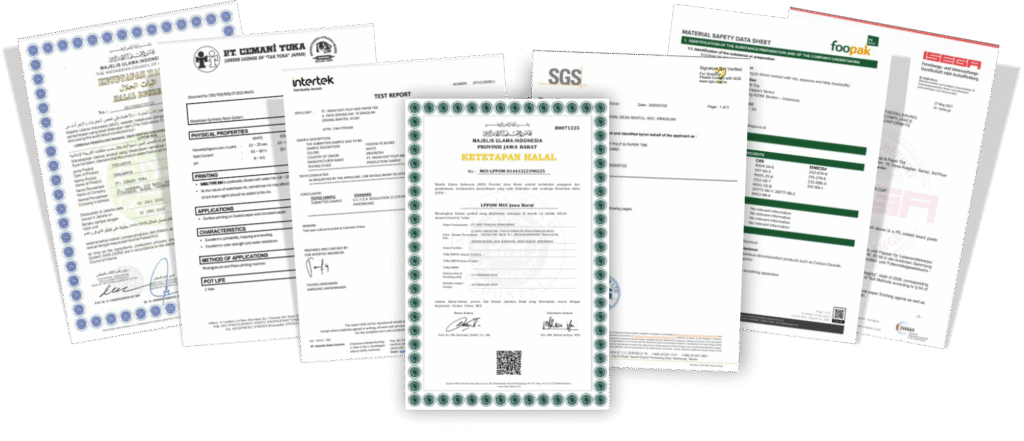 Produk kemasan kami menggunakan 100% virgin pulp, yaitu bubur kertas alami yang diproduksi langsung dari kayu pilihan. Kami tidak menggunakan kertas daur ulang, yang berpotensi mengandung logam berat timbal yang dapat membahayakan konsumen.